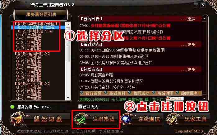 注册的时候随便选择分区的任意线路,即可在此分区任意线路游戏。如下图所示: